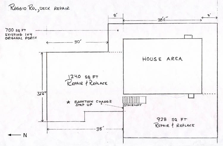 DecksAll pictures except the first one were taken in 2003, with the specific day above each section. Engineering drawings appear at the bottom. North deck, the BIG one (1200 sq. feet). This was taken about a year ago, late October 2002. I took out the old railing so we could cover the top with roofing tin to get through the winter rains. The green & silver stuff is rubberized paint, used in an attempt to seal the top. It didn't work. |